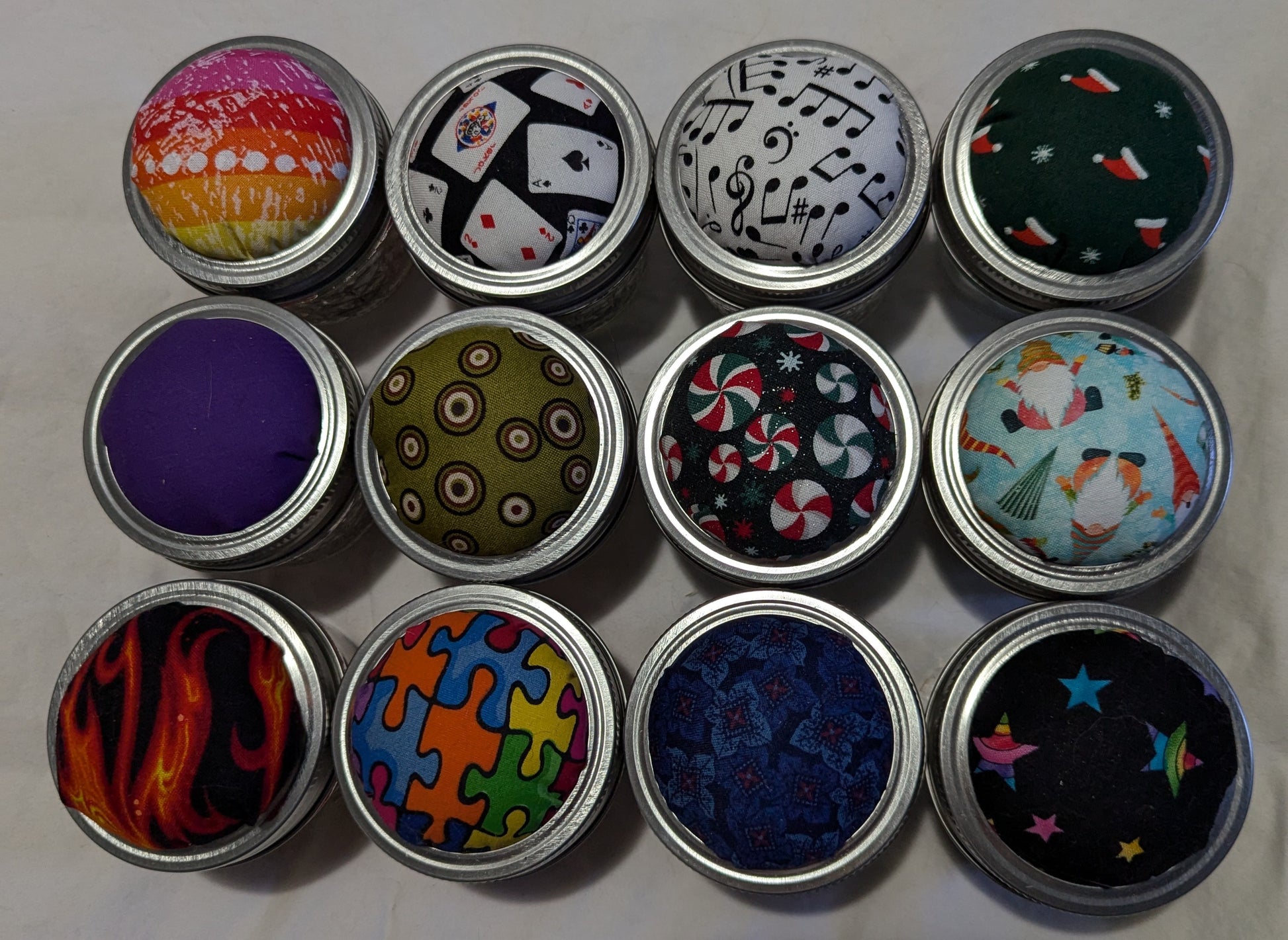 Pin Cushion top screws onto a four-ounce jar to hold sewing accessories